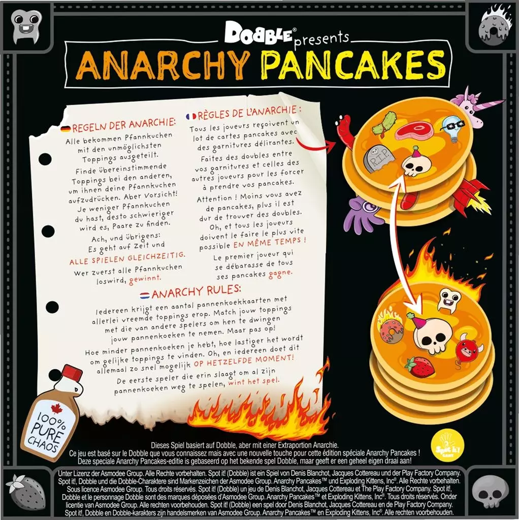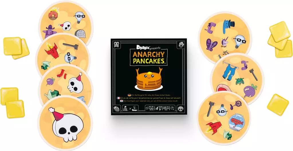 Chaque joueur doit se débarrasser au plus vite de ses cartes Pancakes en les associant par symbole. Mais attention : des cartes Défi viennent bouleverser la partie et ajouter une dose d’anarchie à ce joyeux bazar. Entre gestes rapides, observation éclair et chaos général, Anarchy Pancakes promet des moments de pure folie.