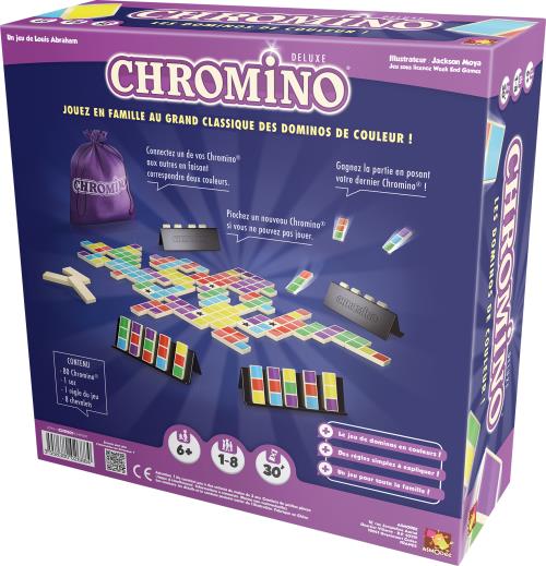 Chromino est un jeu de stratégie moderne qui revisite les dominos grâce à des tuiles colorées. En famille ou entre amis, connectez les couleurs, anticipez les placements et soyez le premier à poser toutes vos pièces ! De 1 à 8 joueurs, dès 6 ans.