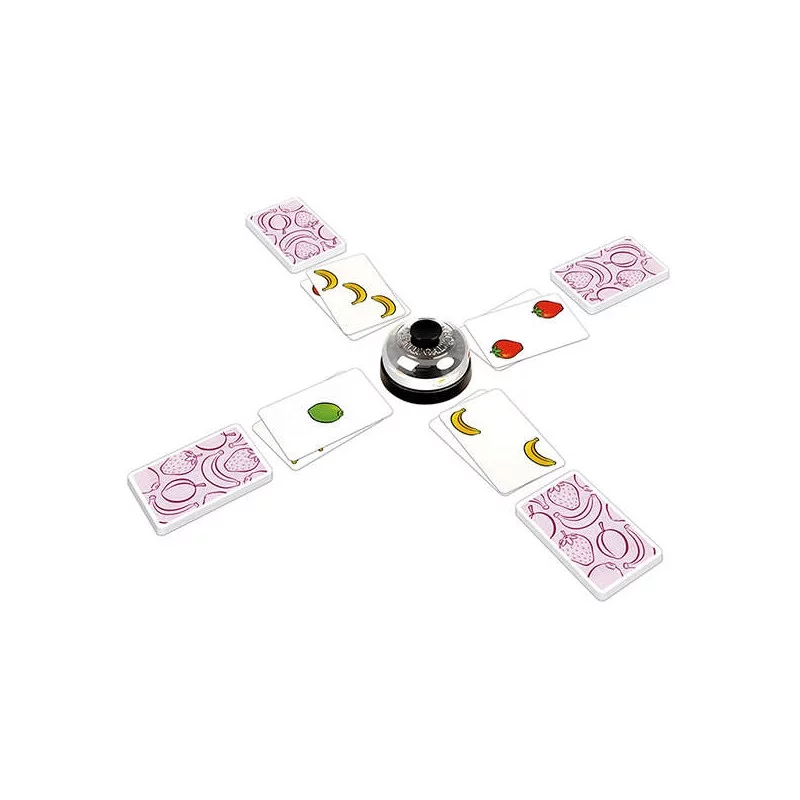 Tour à tour, chaque participant révèle une carte de sa pioche personnelle. L'objectif : identifier instantanément quand exactement 5 fruits identiques 🍌🍌🍌🍌🍌 apparaissent simultanément sur l'aire de jeu. À ce moment précis, la course contre la montre commence ! ⏱️ Le premier joueur à actionner la sonnette centrale 🔔 remporte l'ensemble des cartes visibles.