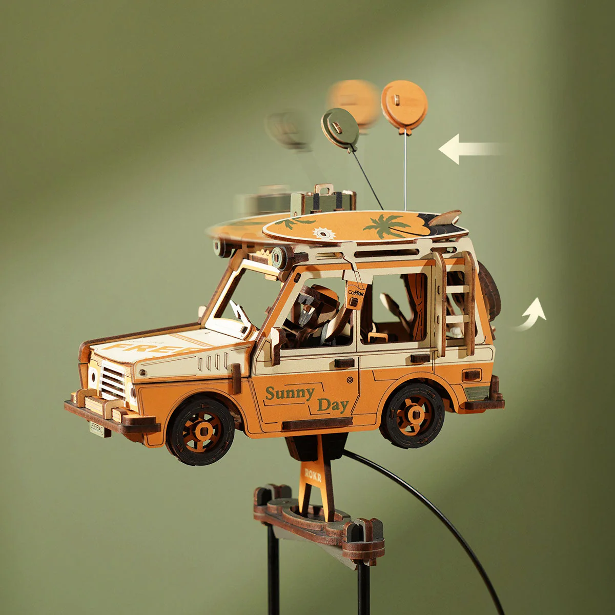 Puzzle 3D en bois ROKR Road Tripper avec mécanisme à balancier. Une maquette animée inspirée du voyage, mêlant ingéniosité et décoration.