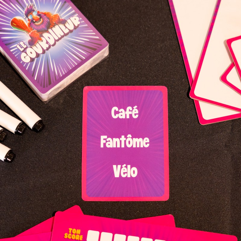 Le Gourdineur est un jeu d’ambiance malin et hilarant où chaque joueur doit inscrire trois mots liés au thème choisi. Le but ? Trouver les mots communs avec les autres pour marquer des points… tout en évitant ceux que le Gourdineur a lui-même écrits ! Un jeu de déduction, de feeling et de lecture dans l’esprit des autres joueurs, idéal pour créer de l’ambiance et des surprises à chaque manche.