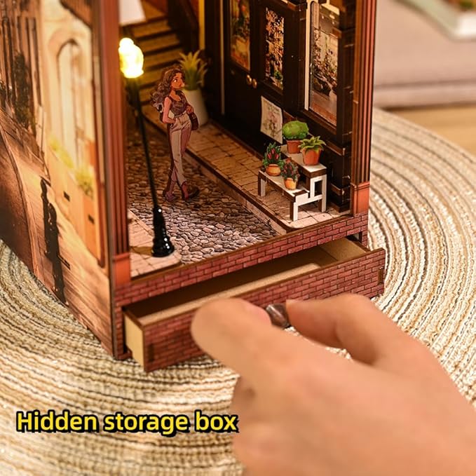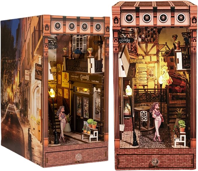 Le kit se distingue par un style classique et immersif, pensé pour évoquer la tranquillité des rues européennes. Chaque élément architectural a été soigneusement découpé pour restituer les textures et volumes qui donnent vie à la scène. Que vous soyez passionné de miniatures ou simple amateur de belles pièces décoratives, ce Book Nook devient rapidement un véritable point focal dans une bibliothèque ou sur une étagère.